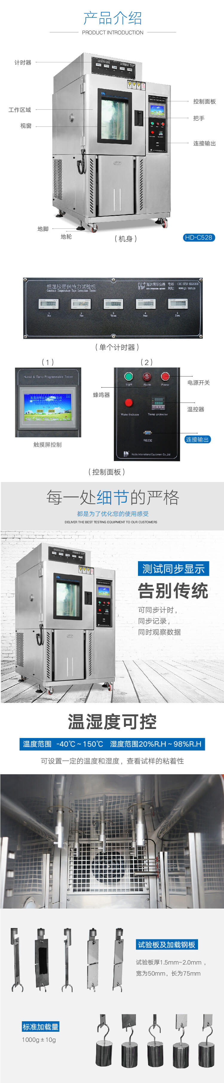 恒溫恒濕膠帶保持力試驗機主要用于測試試樣的抗粘連性,測試壓敏膠帶持粘性,靜態負荷試驗。將膠帶粘于試驗板上, 下端懸掛標準荷重,經一段時間自動計時后, 測量膠帶下滑距離或膠帶粘著時間用來評定膠帶粘著的持久性。